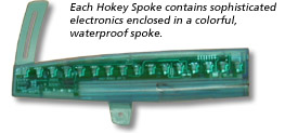 Hokey Spokes are brightly lighted electronic devices that attach to a unicycle (or bicycle) wheel of diameter 24 in. or larger. Each Hokey Spoke has a series of LEDs that flash in sequence to create patterns or even your choice of messages! For maximum visibility and image clarity, use up to 3 Hokey Spokes per wheel.