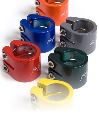 The Kris Holm double bolt seat clamp keeps a strong grip on your seatpost height, while adding a splash of color (if you choose). This clamp fits all currently produced models of Kris Holm unicycles (seatpost diameter: 27.2 mm), but not other major brands of unicycles. Clamp colors match KH saddle colors. Adjustment requires a 5 mm Allen wrench.