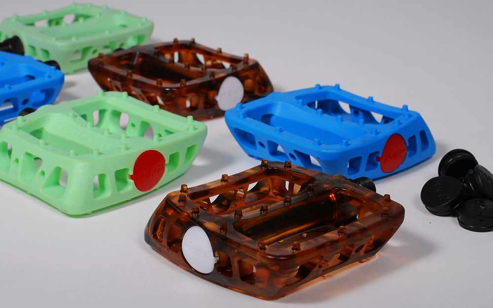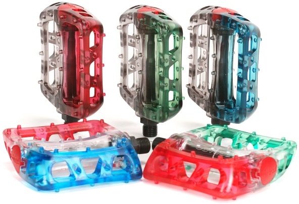 Odyssey Twisted PC platform pedals are made of plastic polycarbonate, 9/16, built in pins; comes with black replacement spindle caps. Call for 1/2 inch Schwinn compatible replacement sets in white or black.